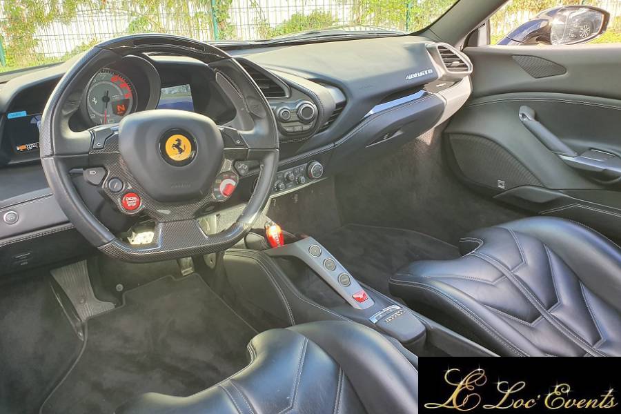 Ferrari 488 GTB, boite automatique double embrayage avec palette au volant mode sport et race, phare led directionnel, siège carbone baquet cuir siglé Ferrari, volant carbone à indicateur de compte tours (option 18 000€), écusson Ferrari sur aile (option), caméra panoramique, stationnement automatique, amortissement piloté, démarrage sans clé, système audio JBL, jantes 20’’